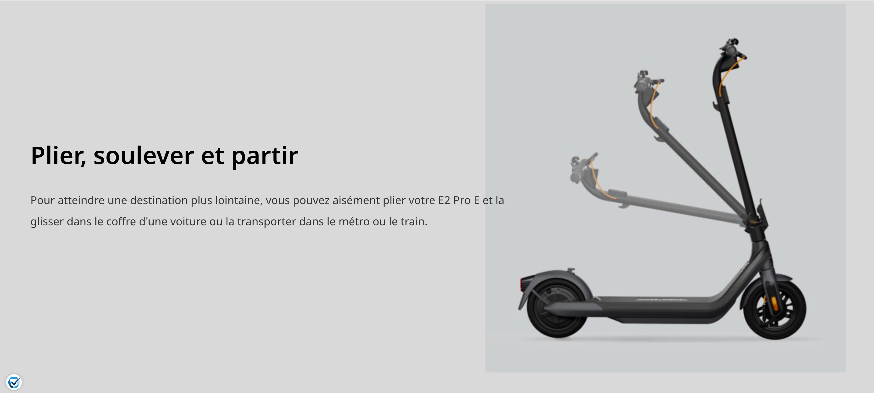 Pour atteindre une destination plus lointaine, vous pouvez aisément plier votre E2 Pro E et la glisser dans le coffre d'une voiture ou la transporter dans le métro ou le train.
